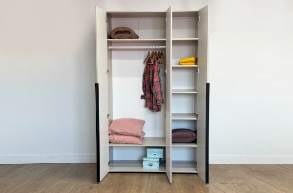 Шкаф имеет удобное наполнение: слева расположены полки для хранения вещей, а справа - штанга для вешалок. Это позволяет рационально использовать пространство и разместить различные типы одежды.